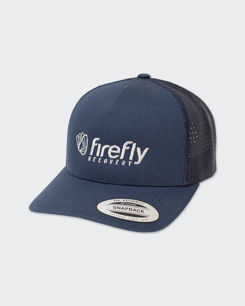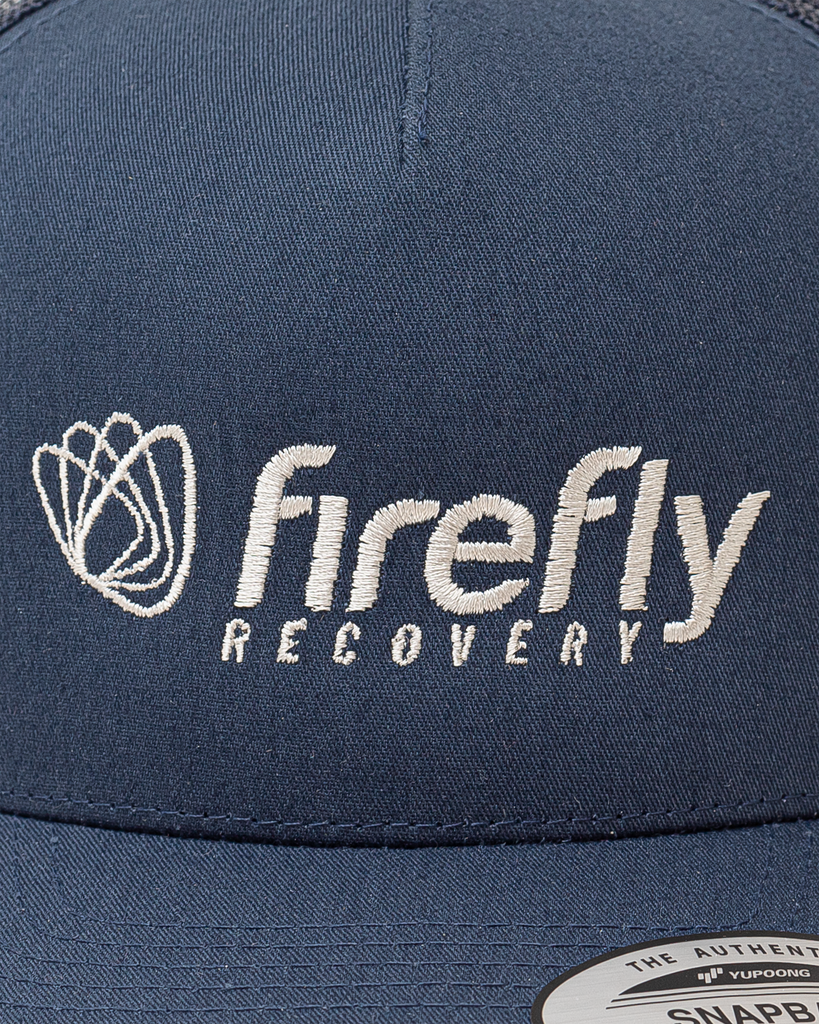Navy snapback hat with firefly logos. Perfect to wear while working out or during post-workout recovery. Super stylish and comfortable! Available in one size with adjustable snap. The perfect gift for any athlete.
